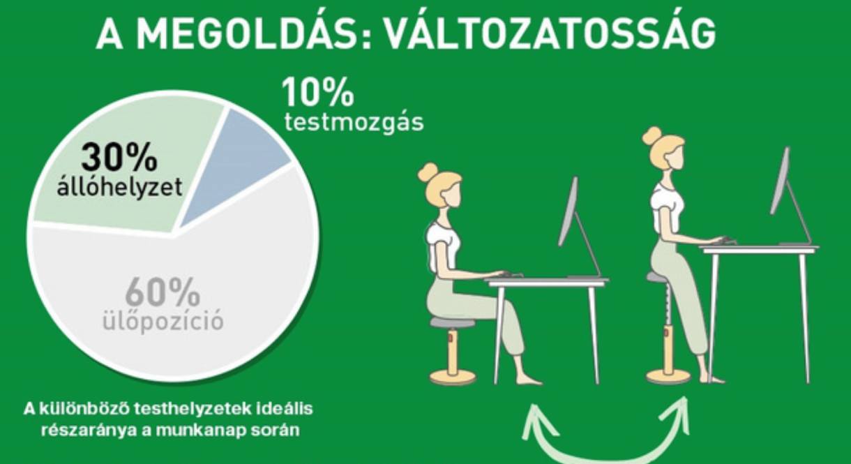 Naponta átlagosan 7 órát töltünk ülő testhelyzetben az étkezések, a munkába járás, valamint a munkavégzés során. A hosszú ideig tartó ülőmunka számtalan mozgásszervi panaszt eredményez, ezen kívül lassítja az anyagcserét, növeli az elhízás, a cukorbetegség, valamint a szívroham és a stroke kockázatát is. Testmozgással és az ergonómiai eszközök használatával jelentősen csökkenthetjük ezen kockázati tényezőket.